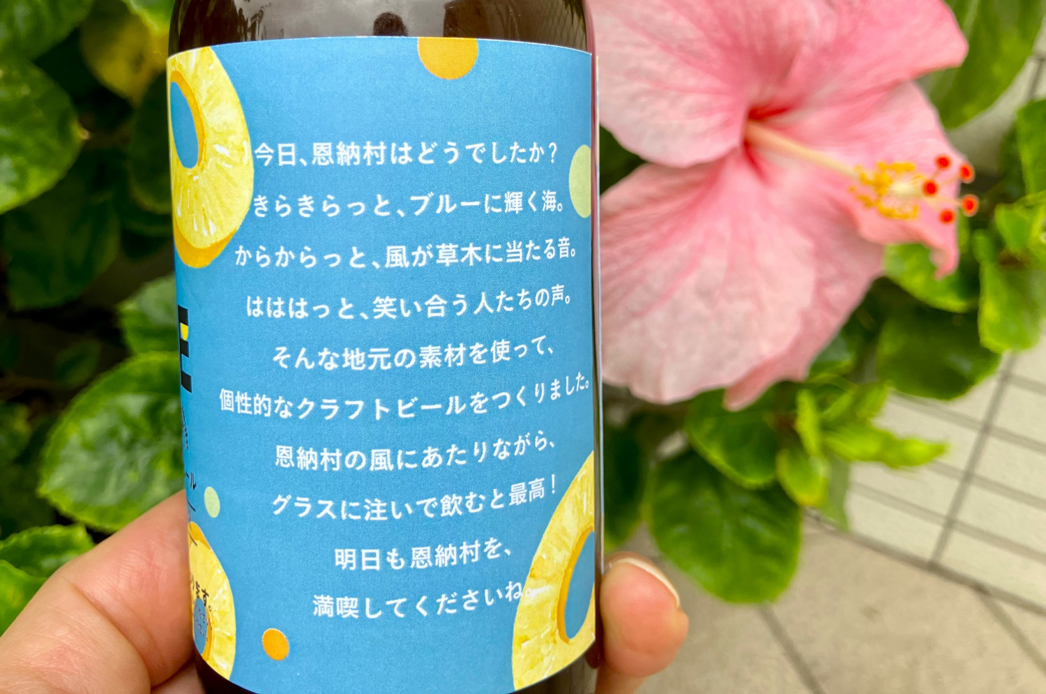 ラベルには、私たちの想いを記しています。是非、恩納村の風にあたりながらONNA NABEE ALEを飲んでいただきたいと思います!