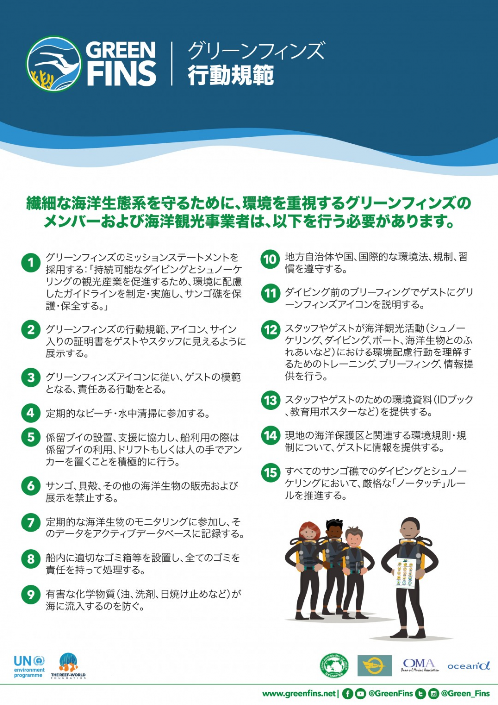 Green Fins(グリーン・フィンズ)のガイドラインを導入し、基準に即しているダイビングやシュノーケリングのショップは、グリーンフィンズメンバーとして認定をされています。Green Fins(グリーン・フィンズ)認定店はGreen Fins(グリーン・フィンズ)の行動規範に沿った運営し、海の環境、サンゴ礁を守りながらダイビングやシュノーケリングのレジャーを提供しています。