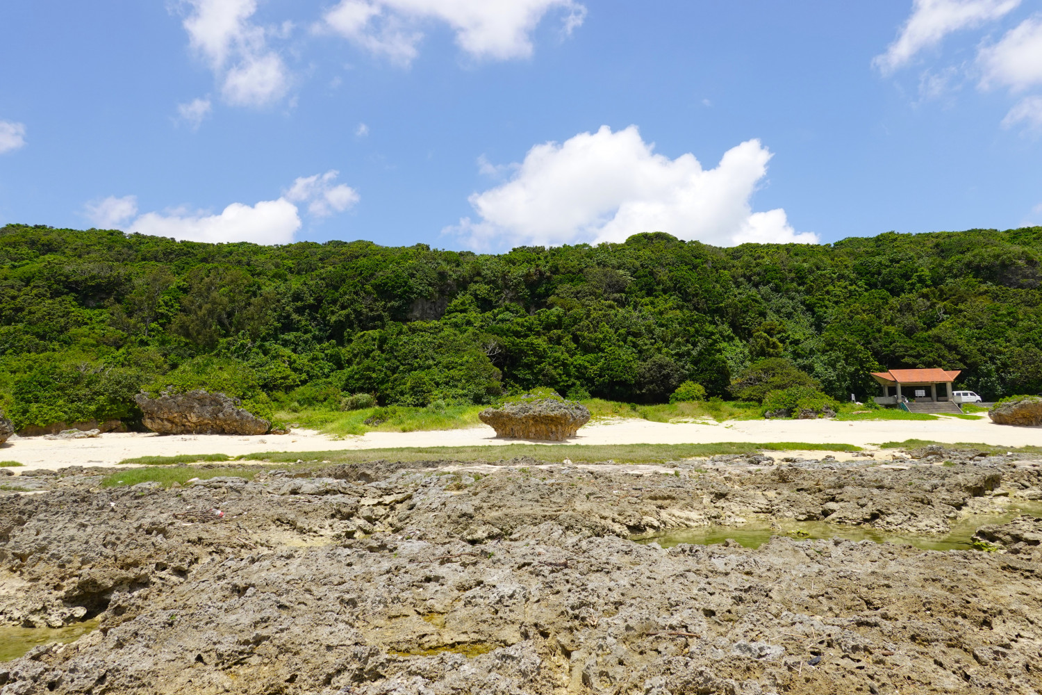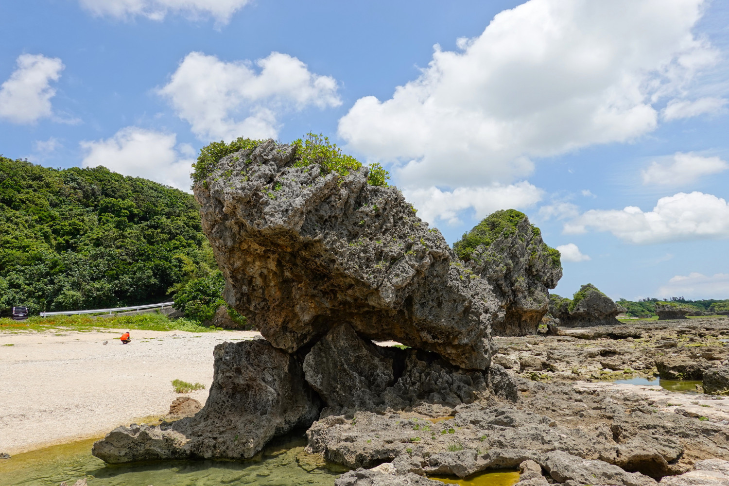この浜は「ぐしちゃんはま」と呼ばれ、草地と砂浜が入交じり数百メートル続く海岸には多くの奇岩を見ることができます。