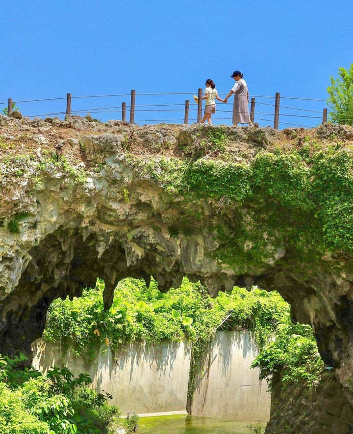 ハナンダーは琉球石灰岩(りゅうきゅうせっかいがん)からできた天然の橋で、橋の下には白水川(しらみずがわ)が流れています。