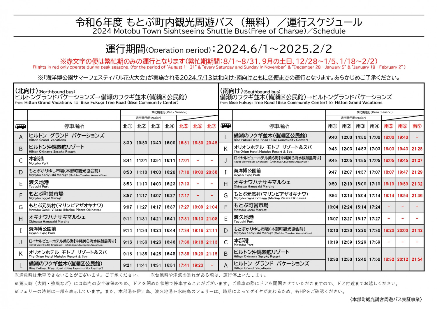備瀬のフクギ並木、海洋博公園、本部港など12か所を経由する無料バス