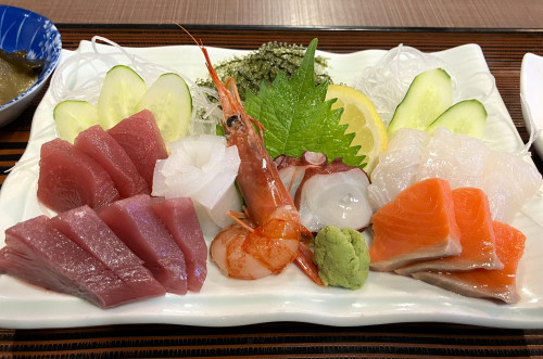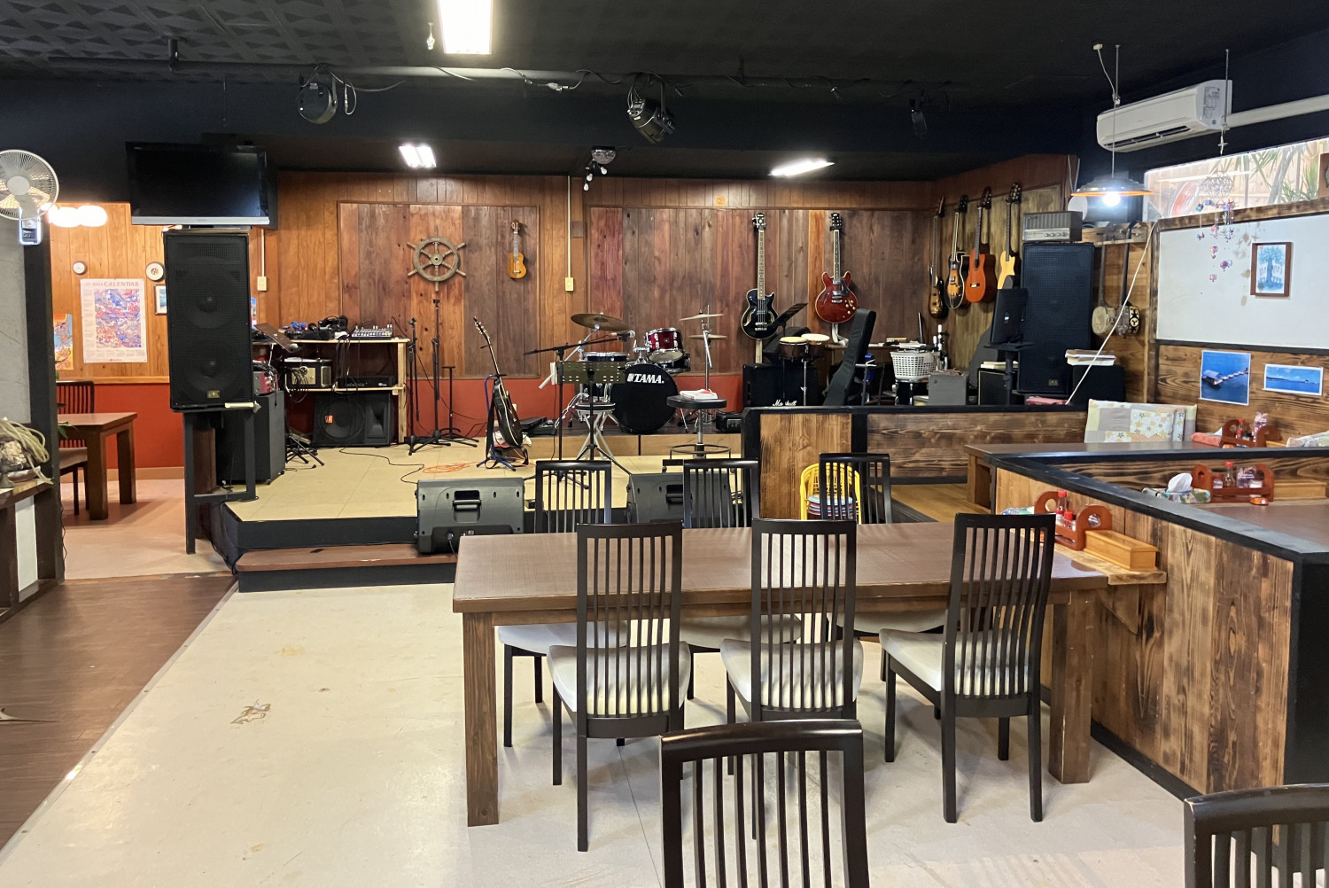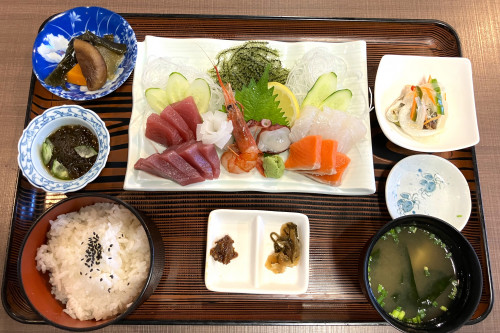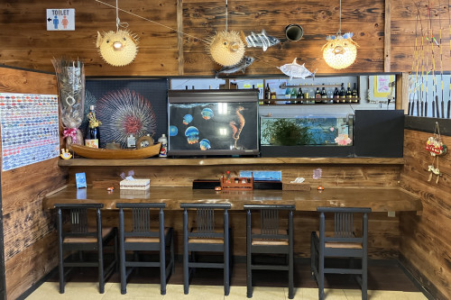 「海人の駅 さかなかなさ」は、本部町の渡久地港北側で、海人が経営する食事処です。近海で獲れた新鮮な海の幸を使ったお料理が自慢で、一番人気は海人定食です。店内にはライブ演奏スペースなどもあり、50名くらいが収容できます。