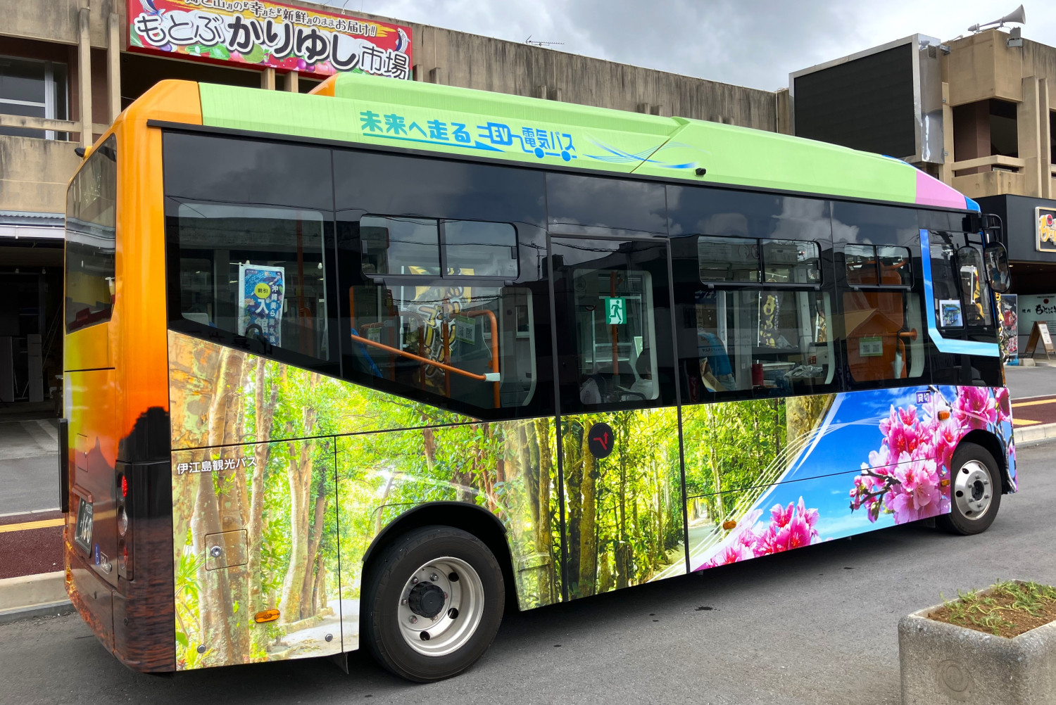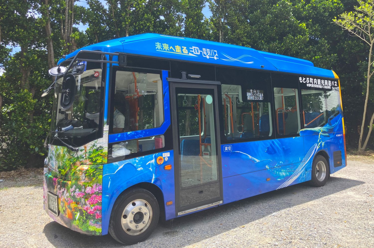 本部町では、観光客のみなさま向けに無料周遊バスを運行しています。乗車は無料で、環境に配慮した観光地を目指し、電気自動車(EV)バスが導入されました。定員は約30人で、車体には本部町の観光各所などがデザインされています。