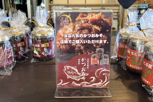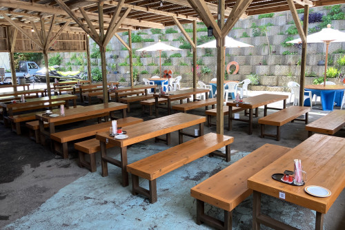 この度、店舗裏に屋根付きで全天候型の多目的スペース(240平方メートル)が整備されました。テーブルを15台設置し、ゆったりとくつろげる憩いの場所になっています。お土産に「自家製かつおみそ」も購入可能です。