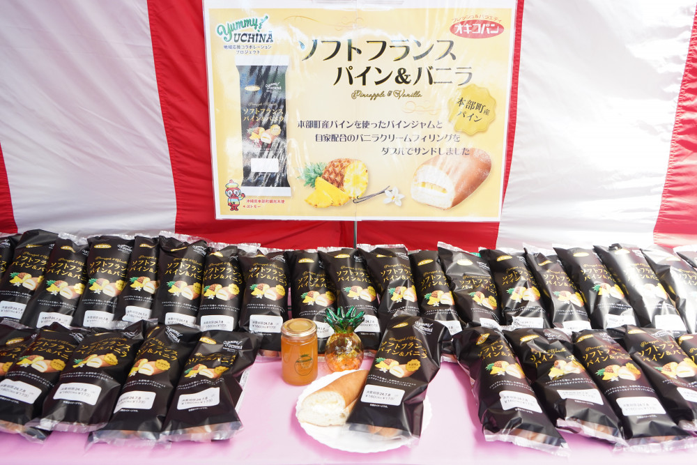 出荷式では、本部町産のパイナップルをサンドしたパン「ソフトフランス パイン&バニラ」も紹介されました。このパンに使われているパインジャムは、本部町の農業生産法人もとぷらすが製造したもので、8月末ごろまで、県内量販店やコンビビエンスストアで販売しています。本部町に行けない方も、沖縄県内各地で本部町のパイナップルを味わうことができます。
