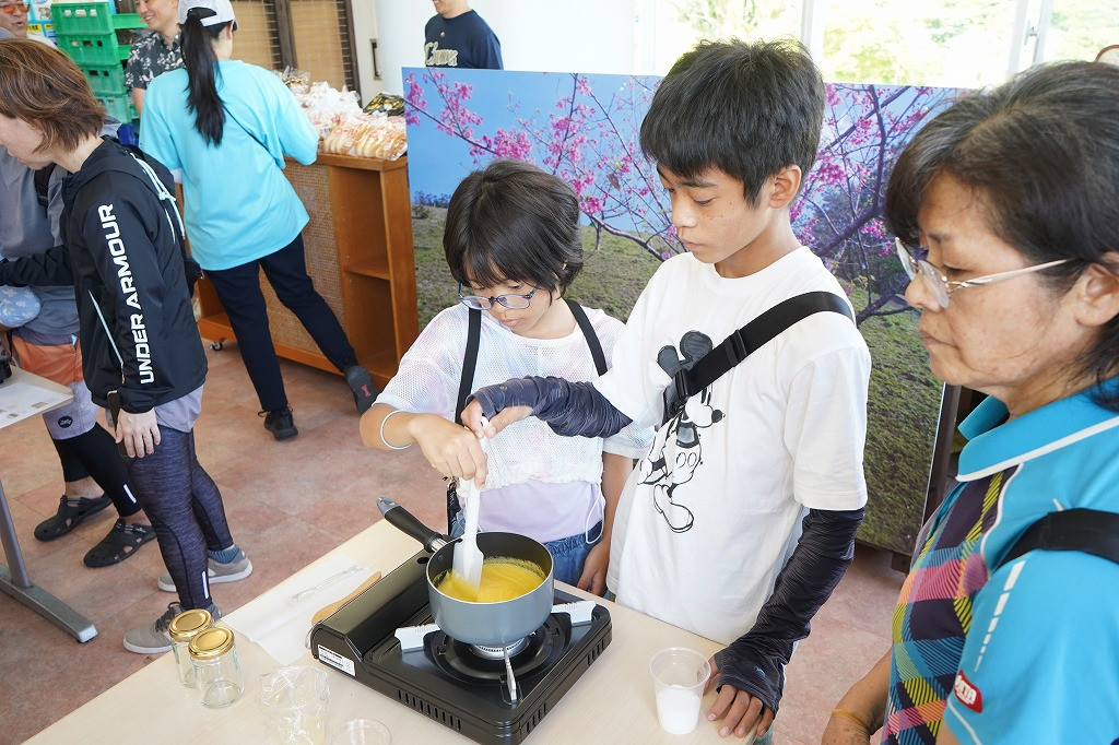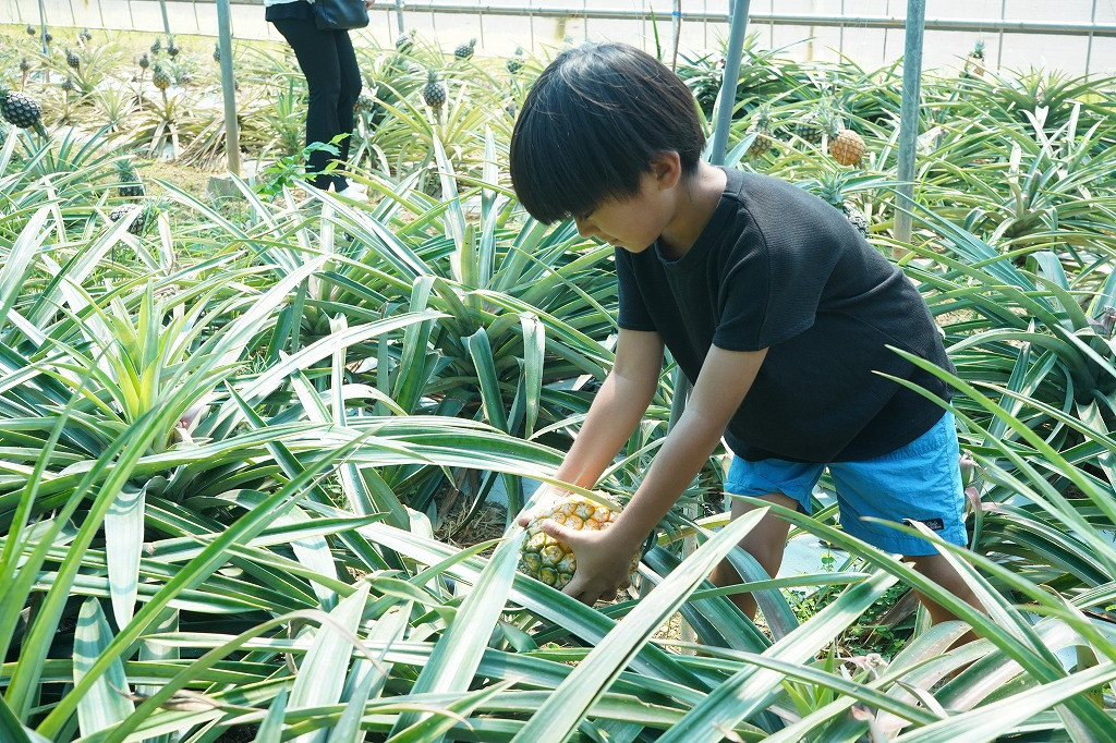 7月13日にはお披露目イベントが開催され、10組、約40名の方々が田空農場で育てられている、1kg を超えるゴールドバレルパインを収穫し、とりたてのパインを使った試食ジャムづくり体験を行いました。参加者の皆様は、できたて手作りジャムを、オキコパンと一緒に食べて、笑顔一杯でした。