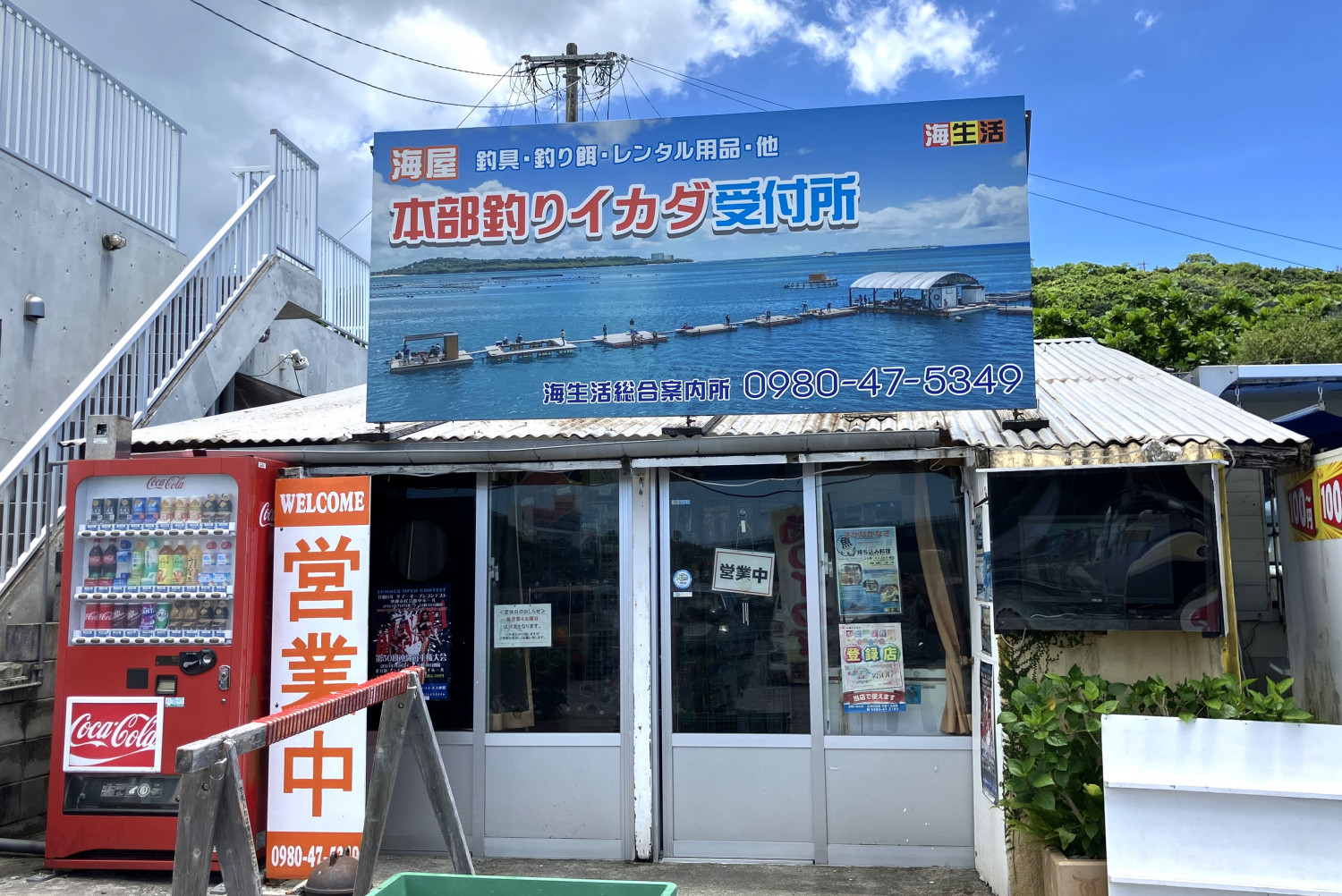 具志堅さんに、渡久地港から渡船で約10分のところにある、釣りイカダやプライベートイカダへご案内いただきました。