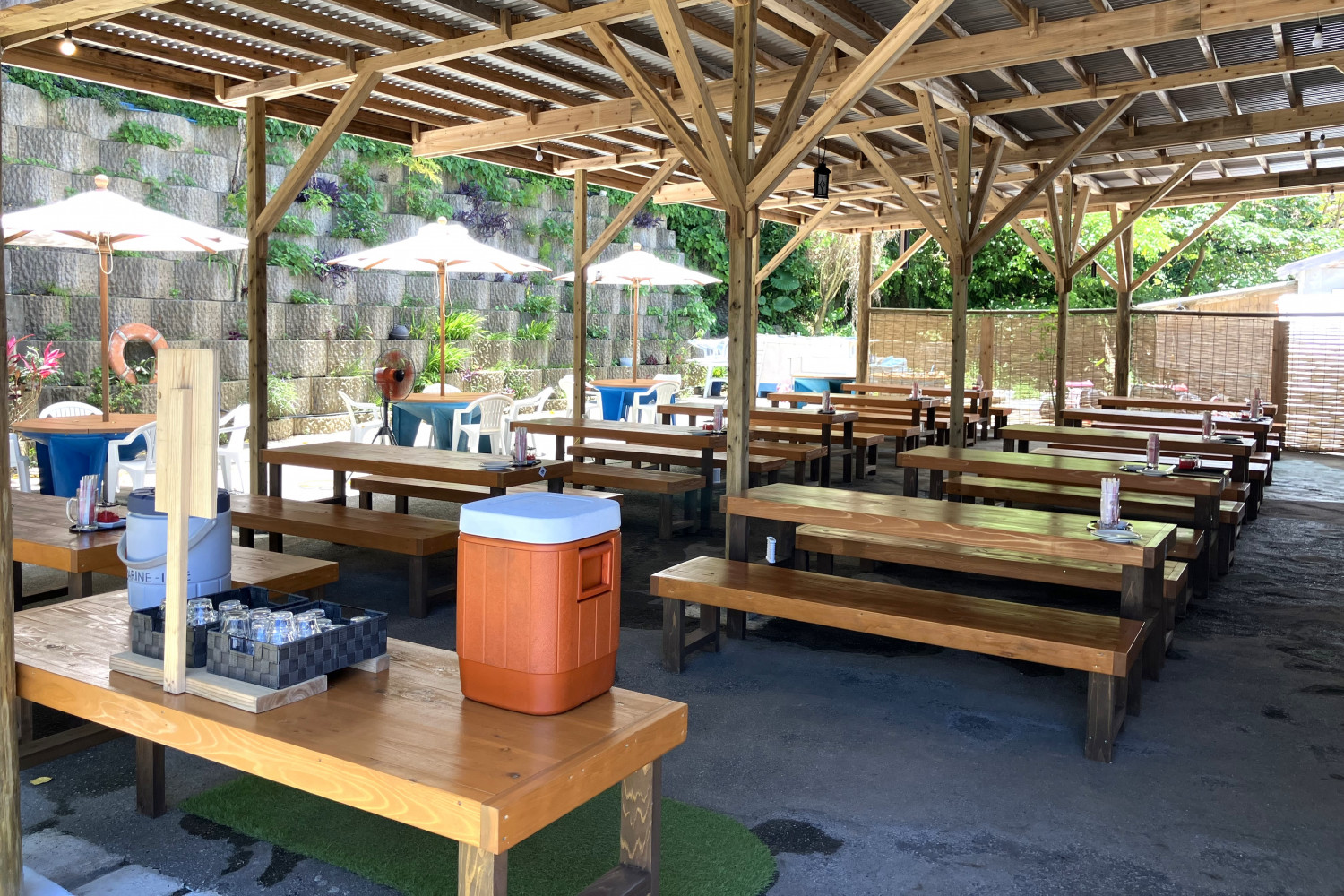 最大収容数は70人。駐車場も広く観光バスでの団体受け入れも可能になりました。民謡などが楽しめるステージも備えており、昼は団体客の受け入れスペース、夜はもとぶ牛などでのバーベキューとビアガーデンの形態で運営します。