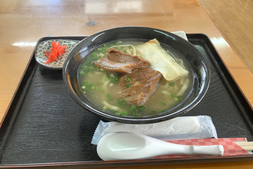 石くびり食堂は、先代の松本ヤスさんとお二人の娘さんが営む地元で愛されるお店です。一番人気は、ソーキ、三枚肉、ゴボウとニンジン入りのかまぼこがのった石くびりそば。手打ちの縮れ麺にあっさり味のスープがよく絡む一品です。