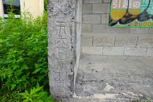 こちら伊集のバス停です。ブロックを積み上げて作られたバス停には、1967年1月15日と刻印があります。まだ復帰前で、車は右側通行だった時代、右側車線を那覇から来たらよく見える場所にバス停が建っています。その当時の空気が感じられる場所です。