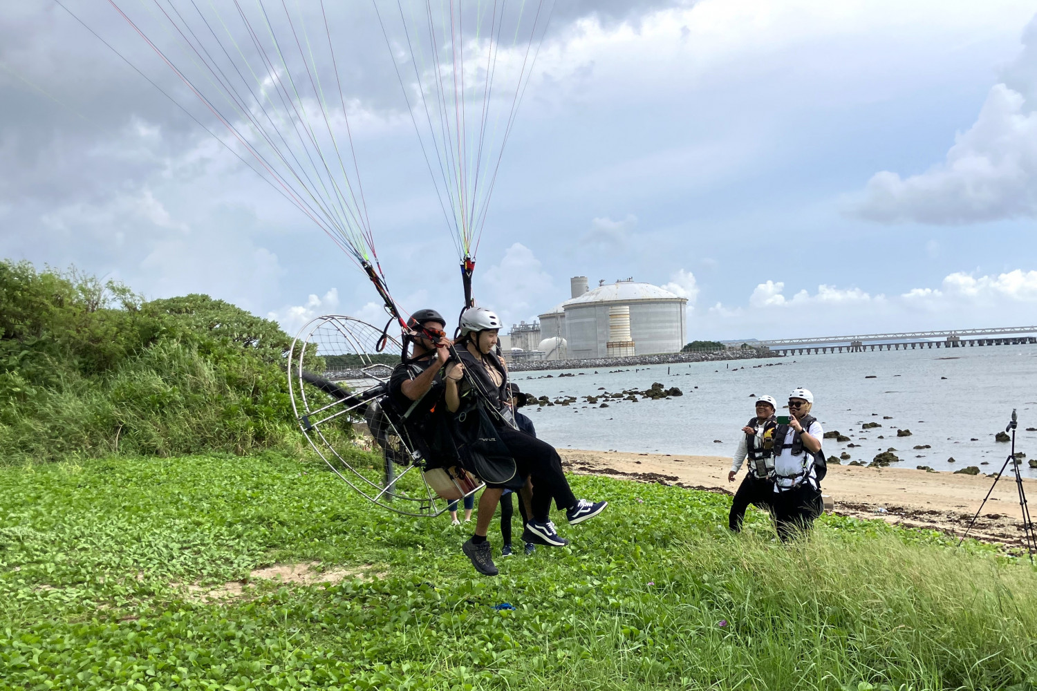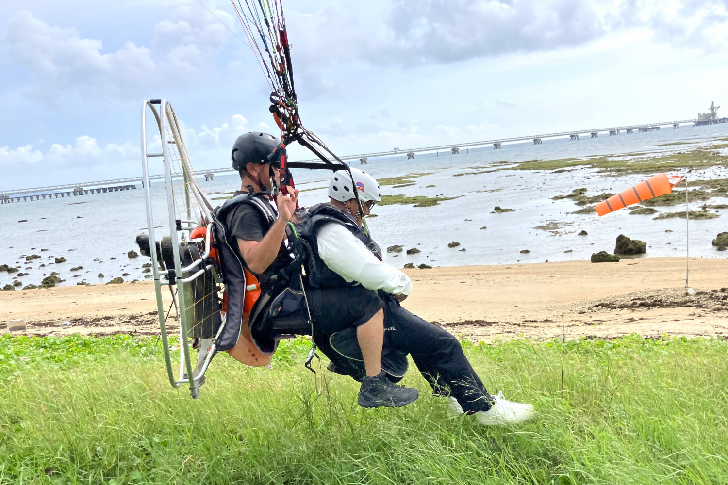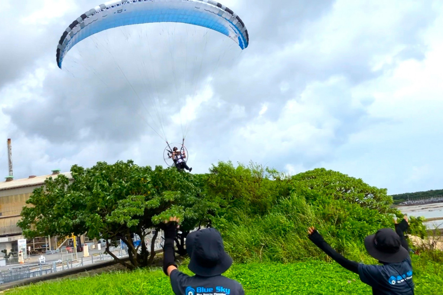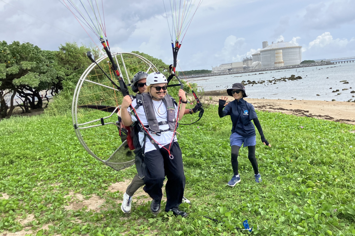 ふわりと浮いて地面から足が離れた瞬間は、ヒヤッとしましたが、上空にあがるとそんな不安も吹っ飛び、気持ちいい風を受けて、普段は見られない風景を楽しむことができました。観光で沖縄に来られる方にとっては、とても良い思い出になるはずです。