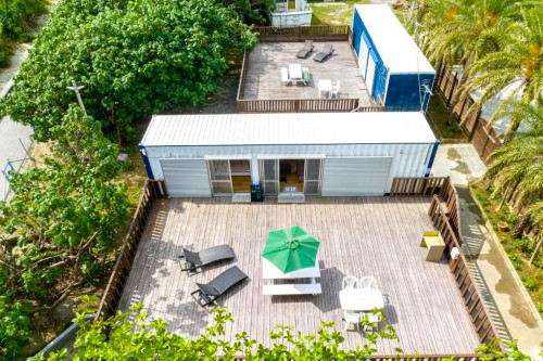 宿泊場所は中城モール裏のビーチサイドに建つコンテナハウス。広いプライベートデッキがついた1棟貸しタイプで、優雅に沖縄を満喫しながら英会話が学べます。宿泊者は1泊につき1時間の英語レッスンがついてきます!