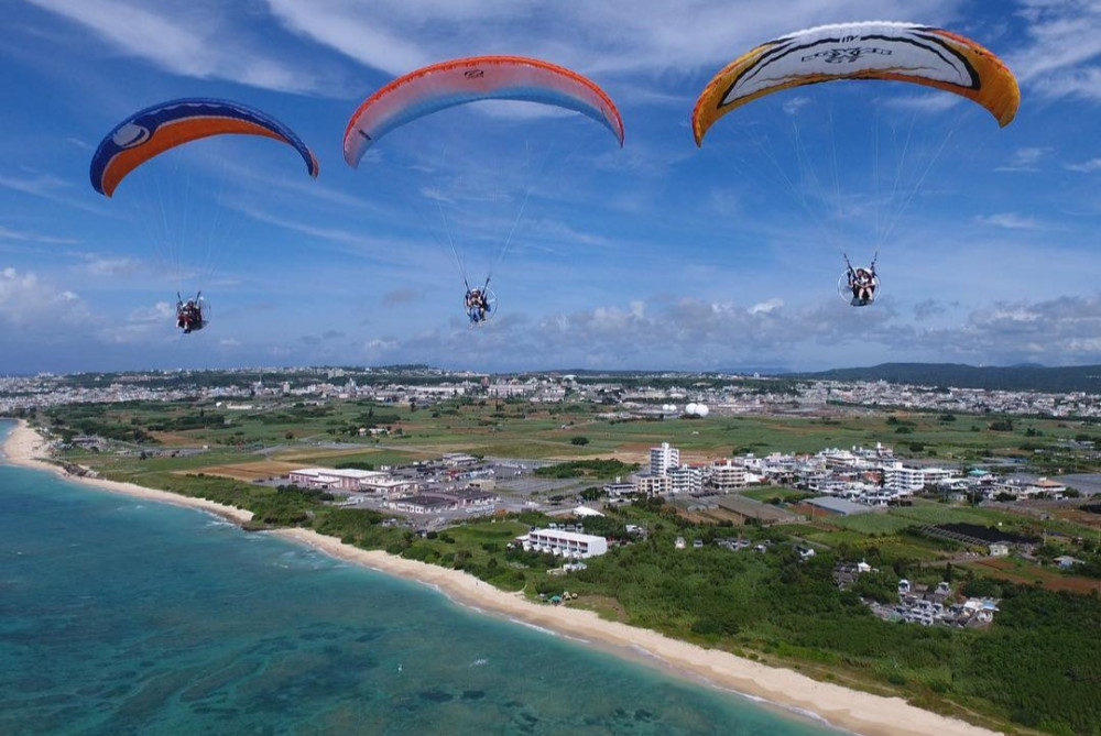 スカイスポーツプランニング ブルースカイでは、中城湾上空でモーターパラグライダーによるタンデムフライトが体験できます。