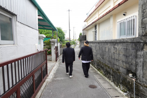 ここは津覇、和宇慶の集落です。戦後のコンクリート造り住宅、まじむん(沖縄の方言で魔物のこと)が入ってこれないようにあえてずらして作った集落内の道、花ブロック等、街並み全体で昔ながらの沖縄を感じられます。ちょうどお昼時、集落を歩くとどこからかいい匂いが漂ってきました。