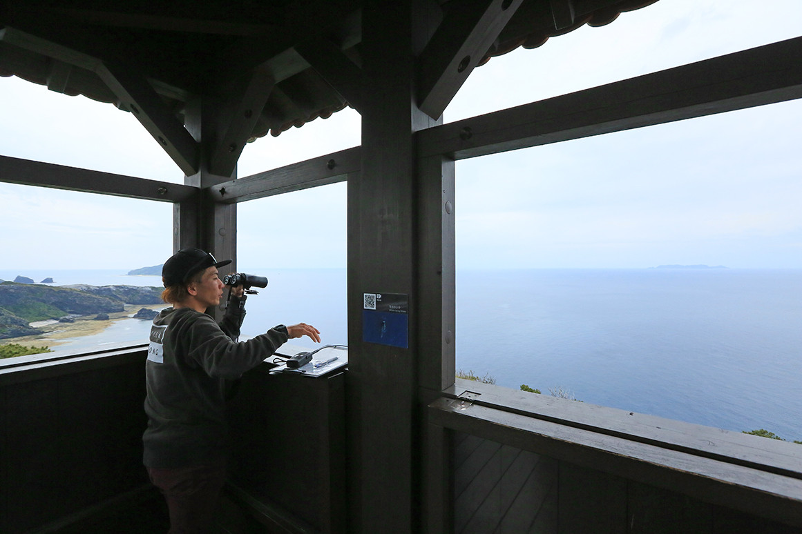 ツアー出港前に展望台から探鯨員がクジラを探し、ウォッチング船を誘導します。そのため遭遇率は9割以上。多くのクジラを見つけることで船を分散し、同じクジラに船が集中するのを防ぎます。できるだけ親子クジラを見ないよう、ペアやメイティングなどへ優先的に誘導します。親子クジラが浅瀬にいる場合、浅瀬に追い込んでしまわないために、近づかないよう船に周知。村外からのマナーの悪いウォッチング船やスイム船を牽制。天候や海況のチェック、船長と連携してルール遵守の助言や船の安全も見守ります。