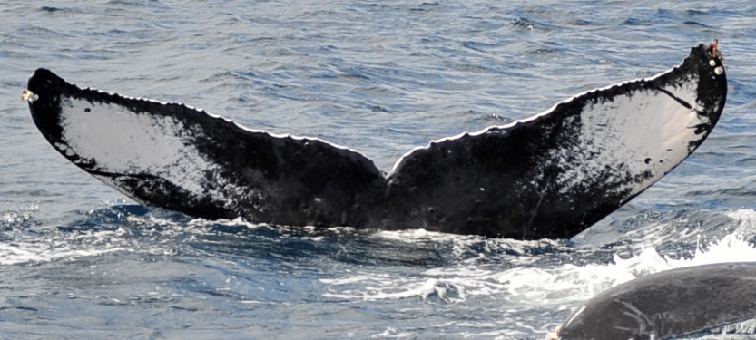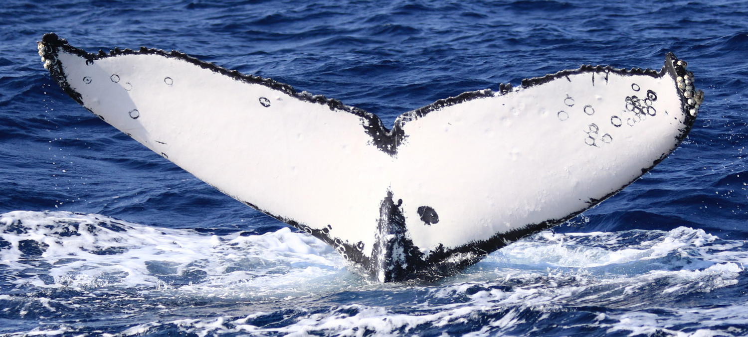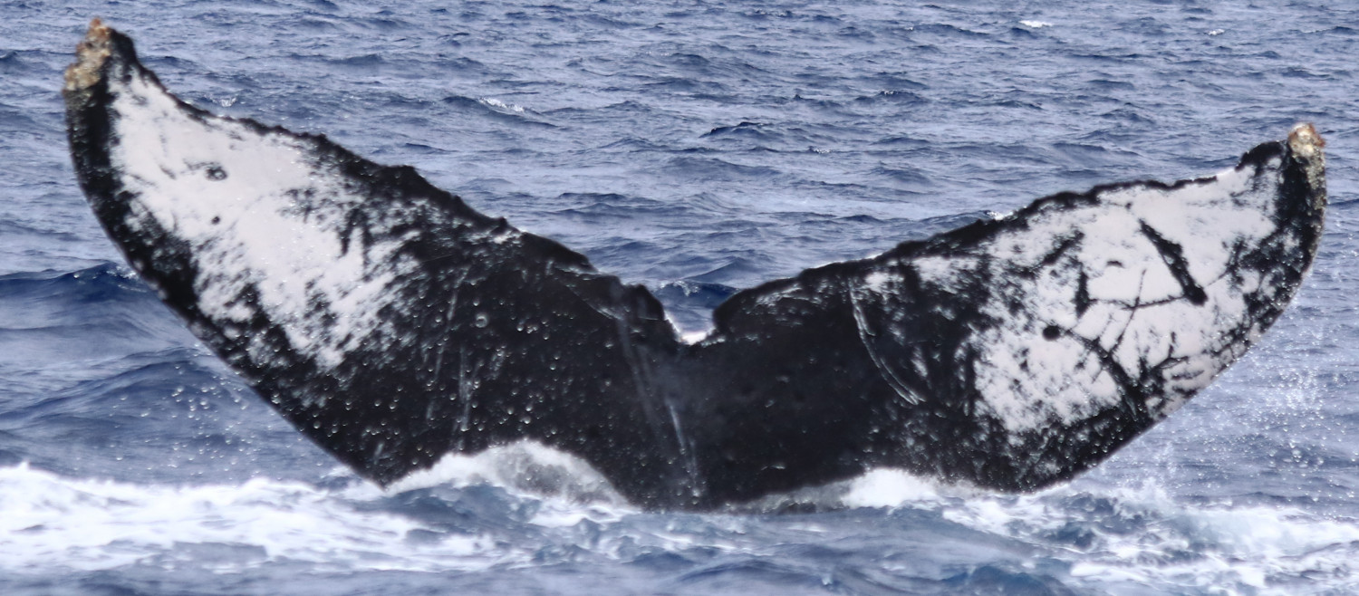 クジラの個体識別は、尾ビレの白黒の模様や縁のギザギザで見分けますが、性格や行動もみんな違っていて、楽しいです。