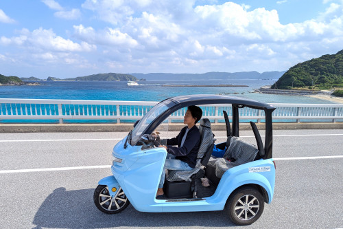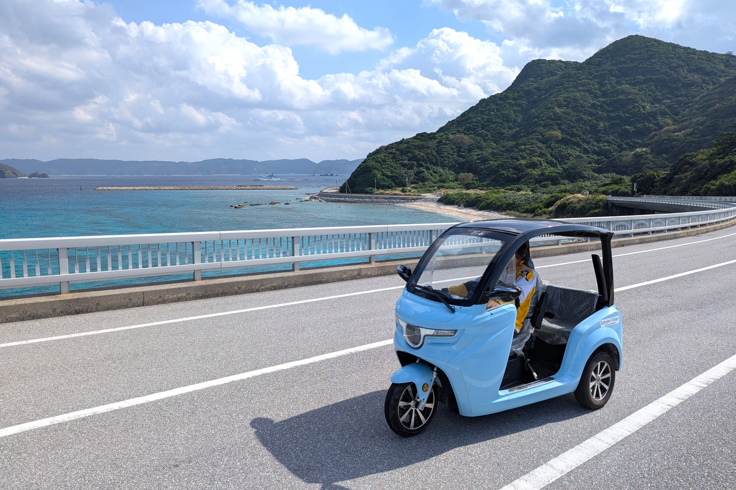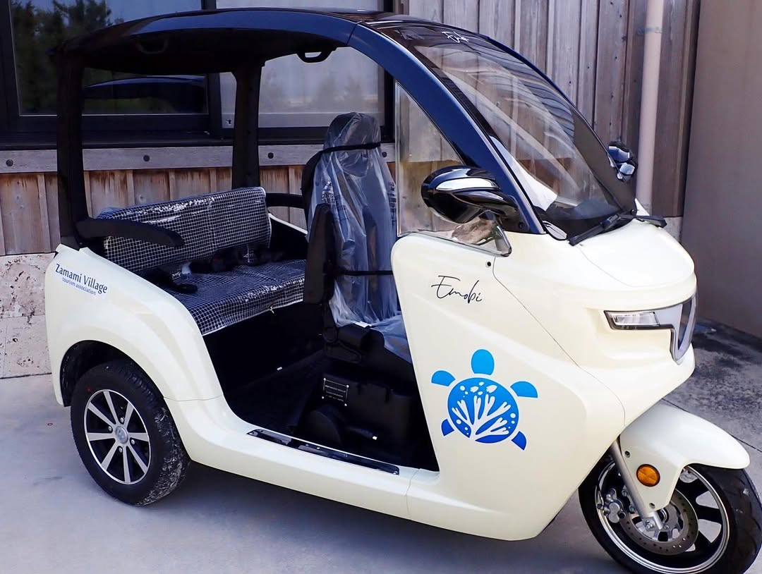 さんごゆんたく館では、2024年6月から「えもび」という3人乗り電動トゥクトゥクのレンタルサービスを開始しました。「えもび」は、普通自動車免許で運転でき、『綺麗な海も見たいし全身で自然を感じたい』『橋でつながる3島を満喫したい』『海沿いをドライブしたい』といった、魅力満載の阿嘉島を堪能したい方に、ピッタリの乗り物です。阿嘉島の風を感じながら、とっておきの風景を見つけることができるはずです。