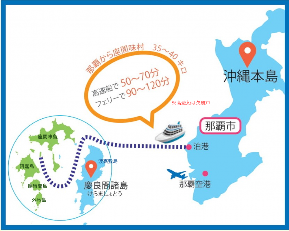 那覇空港から車又はゆいレールで泊港へ、泊港から船で座間味村へ行くアクセス方法がおすすめです。
