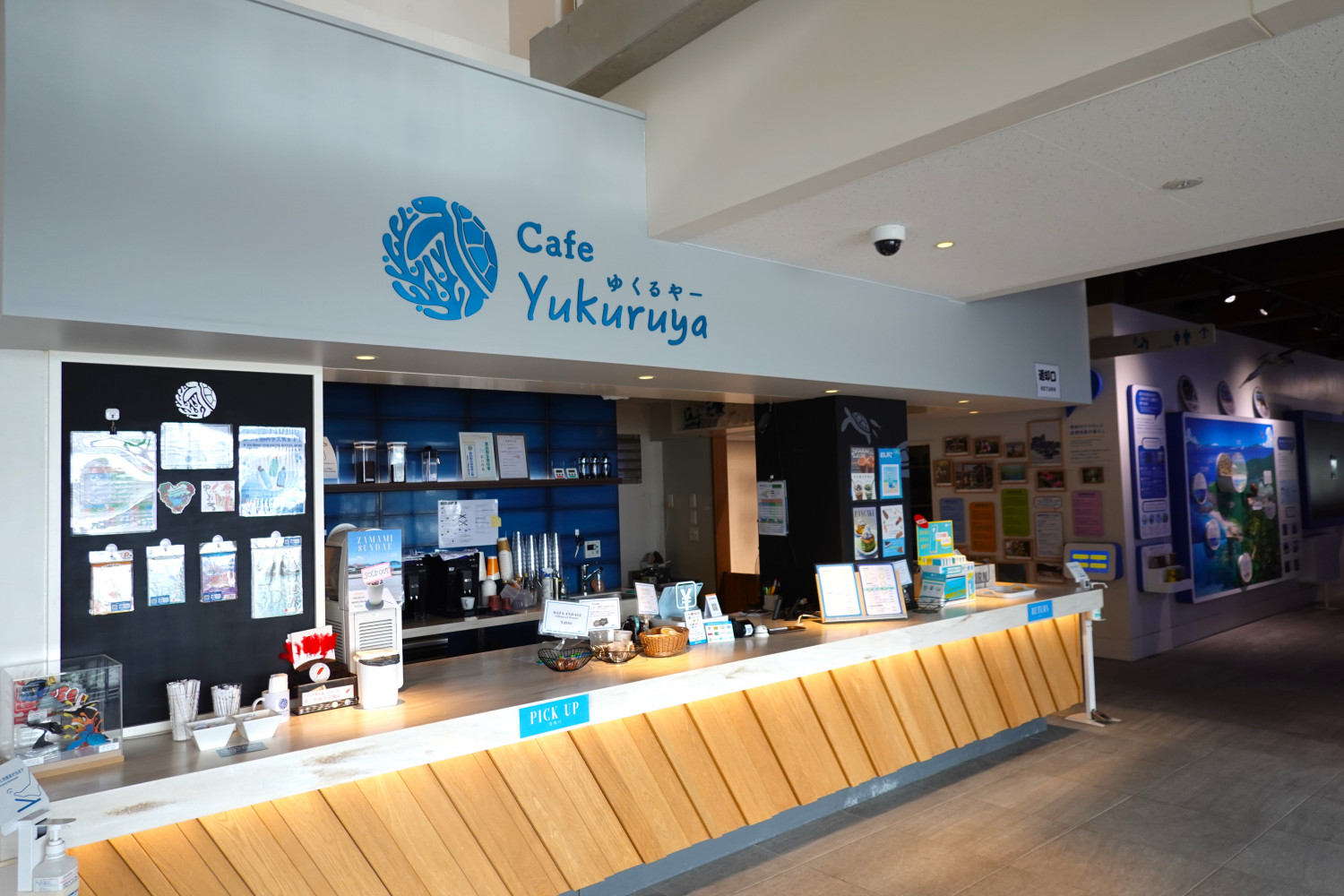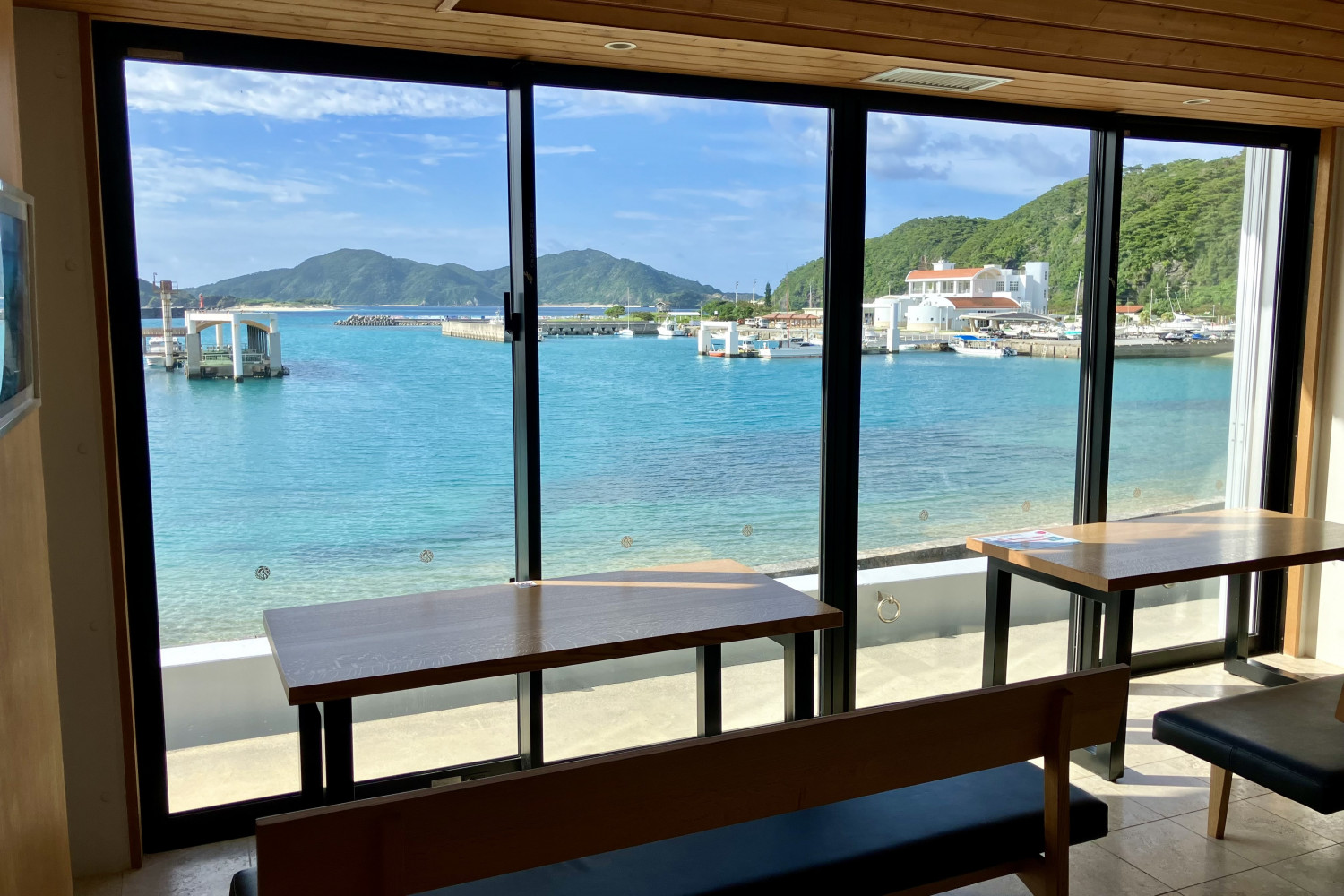 館内には「カフェ ゆくるやー」が併設されており、スナック系の軽食やジェラート、コーヒーなどを楽しむことができます。2階のオーシャンテラスからは、座間味港や美しい海の景色を一望でき、ゆったりとした時間を過ごすことができます。