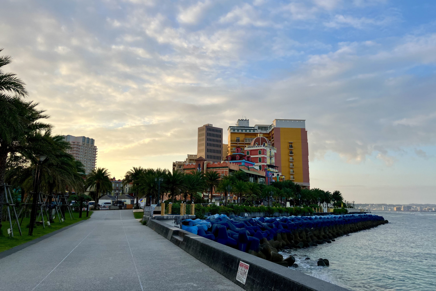 美浜エリアからサンセット、アラハビーチにかけては、西海岸特有の透き通った青い海を眺めながら走れるコースです。特に晴れた日は、海の美しさと青空のコントラストが絶景を作り出します。