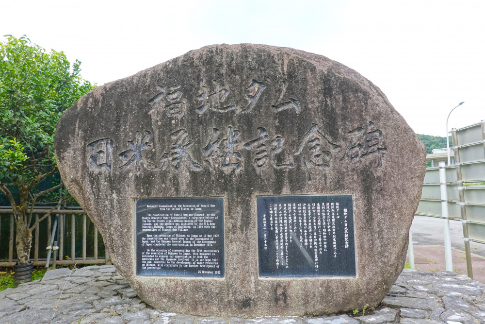 福地ダムは、もともと琉球列島米国民政府が計画し、1969年に米国陸軍工兵隊によって着工されましたが、1972年の沖縄の祖国復帰に伴い工事途中で日本政府へ承継されて工事を継続、1974年に完成しました。この経緯を刻んだ福地ダム日米承継記念碑が建てられています。工事が日本政府に承継されたのち、日米の安全基準の違いから広げたり勾配を緩くしたりの工事を実施したそうです。沖縄ならではのエピソードです。