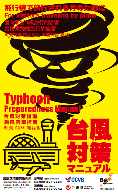 台風対策マニュアルでは、台風の特徴や沖縄旅行中での注意点、対処法をはじめ、航空会社の一覧や空港内の便利な施設など、お役立ち情報をまとめて紹介しています。また、全5言語(日本語、英語、簡体字、繁体字、韓国語)をページごとに分けて掲載しています。