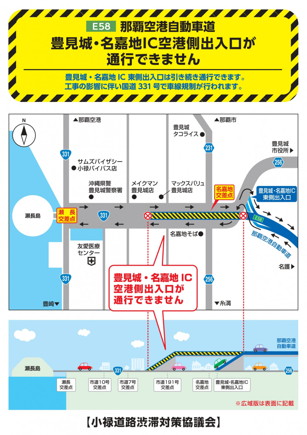 2023年7月5日(水)から、那覇空港から南に位置する、小禄道路名嘉地ランプの撤去に伴い、豊見城・名嘉地IC 空港側出入口が通行止めとなるとともに、国道331号(一部区間)は一時的に車線数が減少となるため、周辺の交通渋滞にご注意ください。