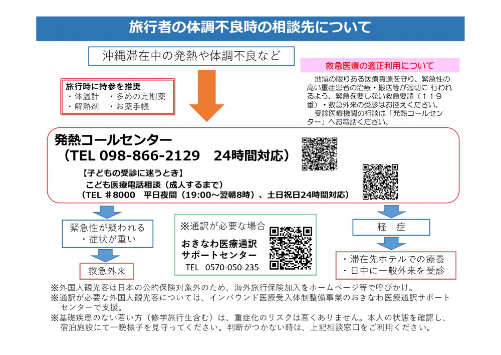 沖縄県では沖縄を訪れるみなさまが体調不良になったときのために、コールセンターを設けています。是非、ご活用ください!