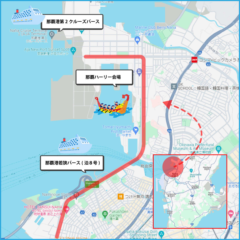 さらに、那覇港泊8号及び第2クルーズバースにおいては、クルーズ船が5月3日(土)に1船、5月5日(月)に2港同時入港予定となっており、那覇港からハーリー会場(若狭・泊・安謝・港町)周辺にかけて激しい交通渋滞が生じることが予想されます。