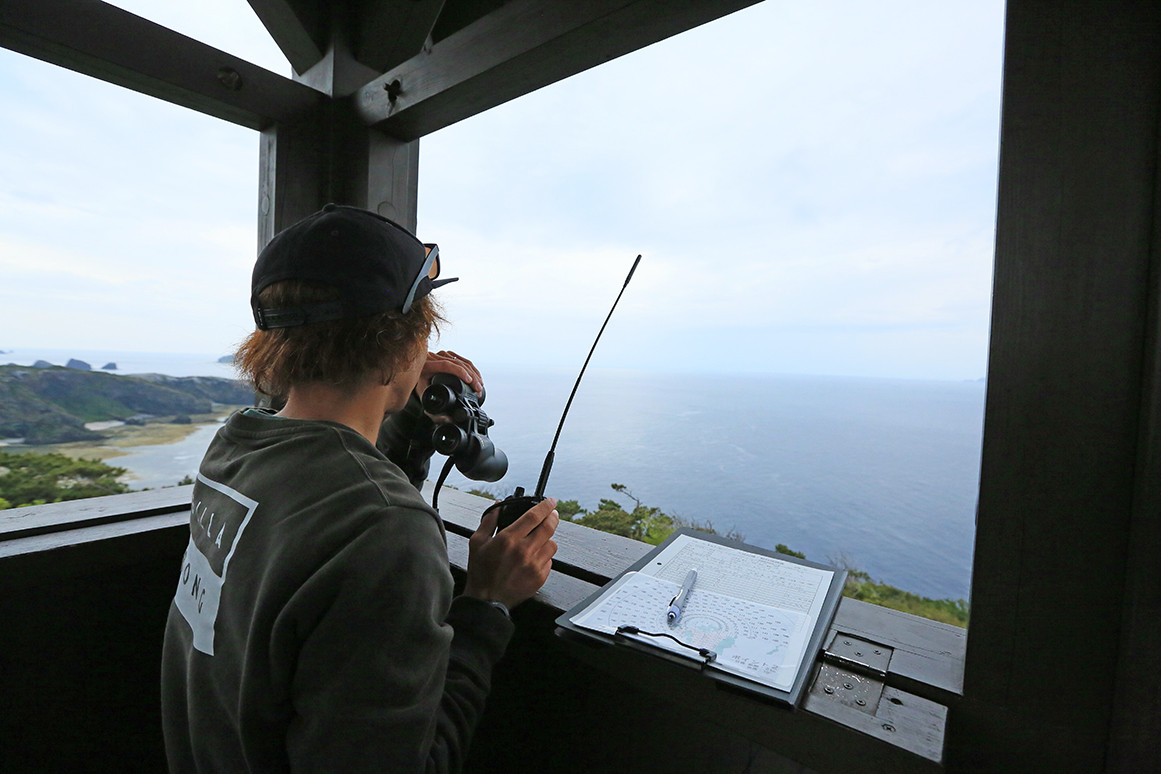 ツアー出港前に展望台から探鯨員がクジラを探し、ウォッチング船を誘導します。そのため遭遇率は9割以上。多くのクジラを見つけることで船を分散し、同じクジラに船が集中するのを防ぎます。できるだけ親子クジラを見ないよう、ペアやメイティングなどへ優先的に誘導します。親子クジラが浅瀬にいる場合、浅瀬に追い込んでしまわないために、近づかないよう船に周知。村外からのマナーの悪いウォッチング船やスイム船を牽制。天候や海況のチェック、船長と連携してルール遵守の助言や船の安全も見守ります。