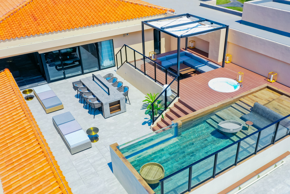 全室西海岸を臨むオーシャンビューで、バルコニーには屋外ジェットバスとデイベッドを完備。また、「アクアテラス」にはインフィニティプールやジェットバス、オープンエアバー、チルアウトスペースなど様々なエリアがあり大人からこどもまで幅広く楽しめる空間です。