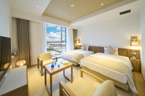 客室はモダレットルームやツインベッドルーム、トリプルベッドルームなど様々なタイプの客室があり、それぞれのスタイルに応じて利用できます。明るくリゾートを感じられる白を基調としたお部屋は自宅のように寛げます。