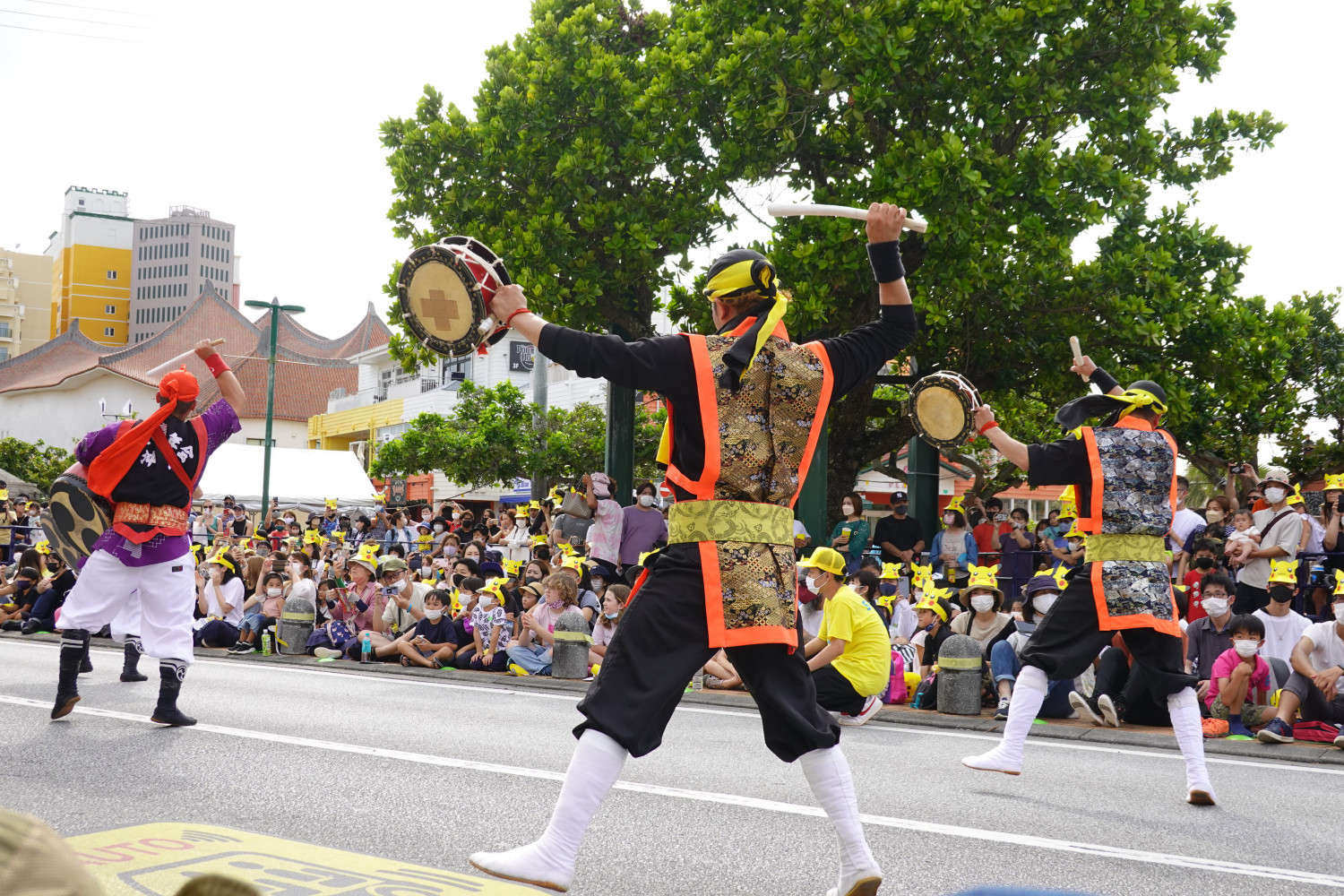パレードの冒頭で北谷町栄口青年会の皆さんからエイサーの演舞が披露されました。太鼓の音が胸に響き、迫力ある演舞が印象的でした。
