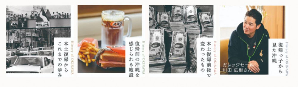 「おきなわ物語」では、沖縄返還から現在までの「歩み」や「本土復帰前後でかわったもの」を当時の写真や施設、スポットを通して振り返る特集ページを公開しています。