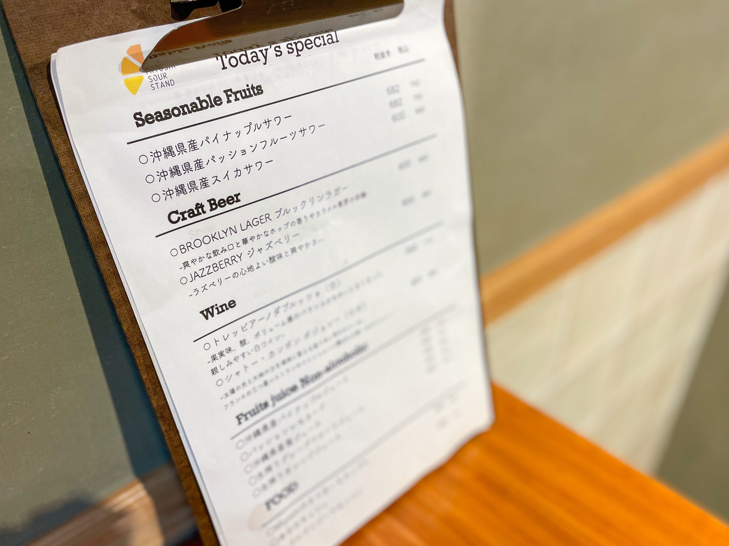 4月3日(日)に、牧志公設市場近くにオープンした「Miyoshi Sour Stand(ミヨシサワースタンド)」は、旬の沖縄県産フルーツをたっぷり使ったフルーツサワーが楽しめるお店。メニューは、看板メニューのSeasonable Fruit(季節のフルーツを使ったサワー)のほか、クラフトビールやワイン、ノンアルコールのフルーツジュースなどのドリンクに加え、自家製さつまいもチップスなどの軽食も。取材時には果肉感たっぷりのパッションフルーツやイチゴ、スイカなどを使ったサワーが楽しめました。旬によって提供内容が変わるので、訪れる度に出会いがありそう!