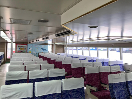 A. 大型船なので揺れは少ないと思います。船内には青いシートと赤いシートがありますが、赤いシートの方が比較的揺れを感じない配置になっています。揺れが気になる方は赤いシートをお選びいただくと良いかもしれません。