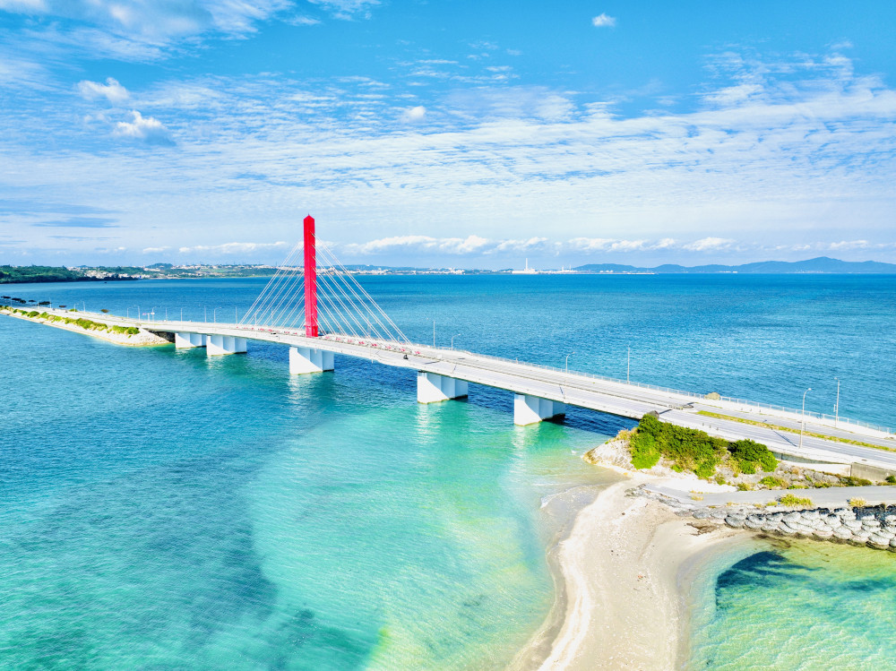 1997年2月7日に開通したうるま市の平安座島と浜比嘉島を結ぶ全長900mの橋。海中道路から見えるダイナミックな橋で、橋の上から見下ろす景色がとてもキレイです。