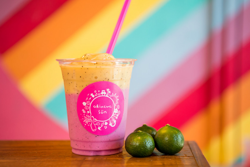 ひときわ目をひくピンク色の古民家では、勝山シークヮーサーをはじめとしたやんばる産のフルーツを使ったスムージーやドリンクが味わえます。「okinawasunスペシャルスムージー」はドラゴンフルーツやパッションフルーツ、シークヮーサーなどを組み合わせており、南国のさっぱりとした美味しさが味わえます。