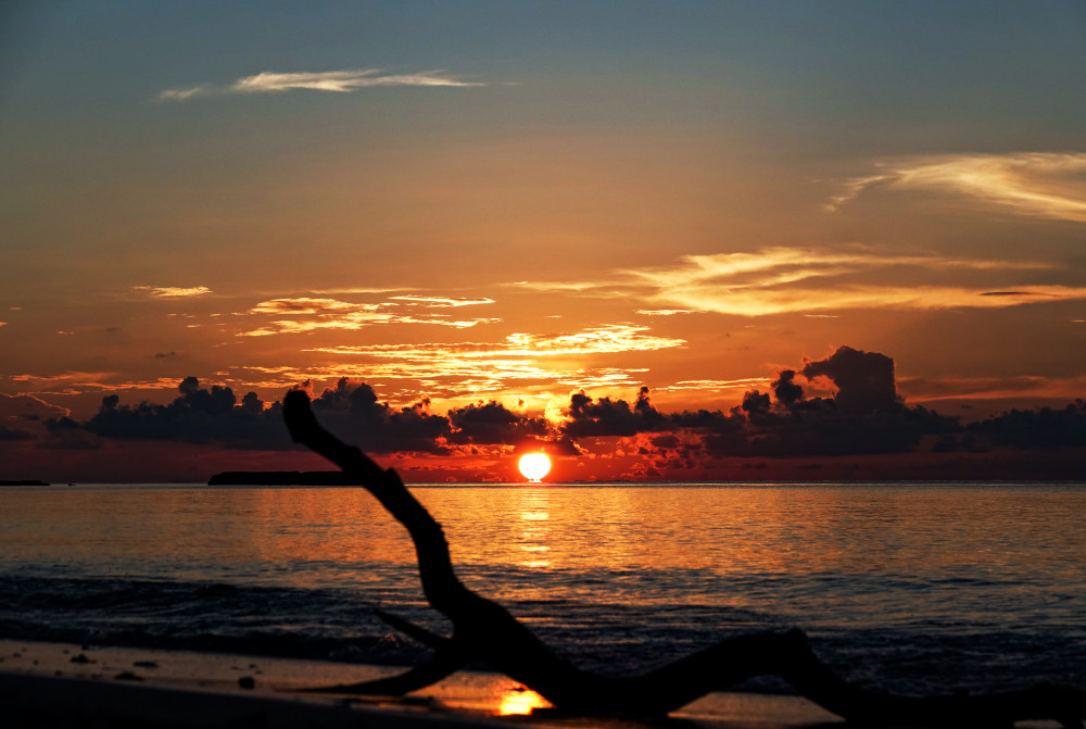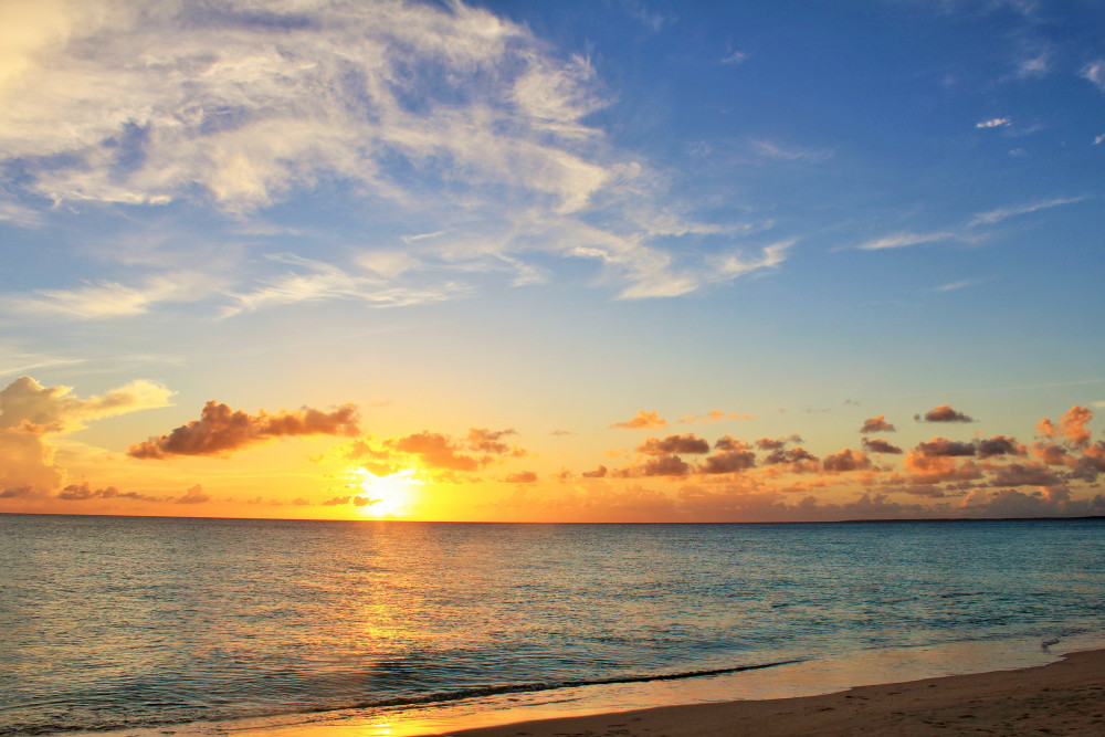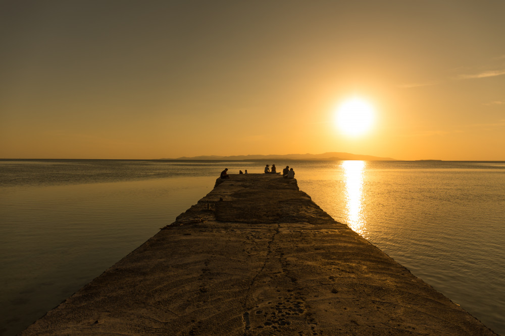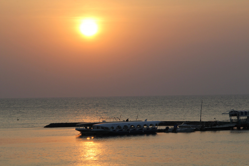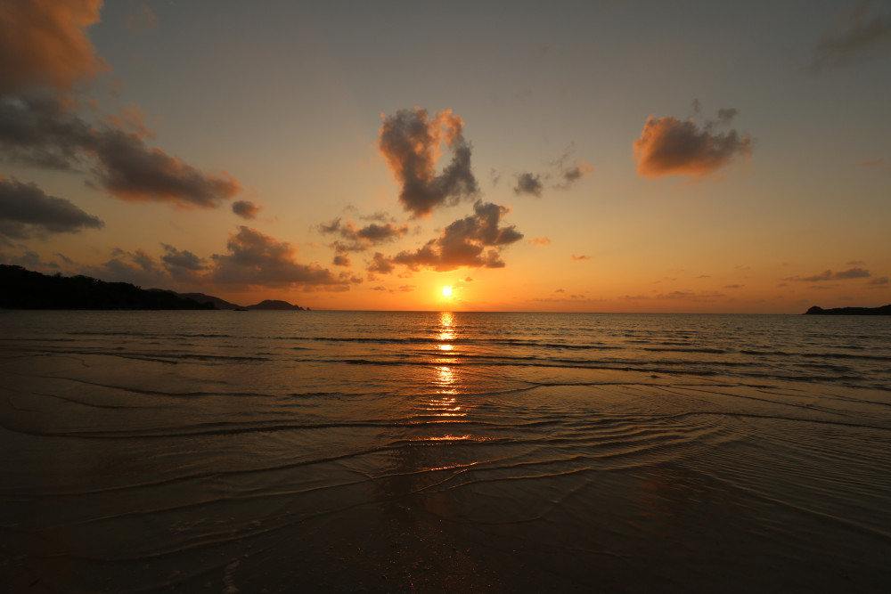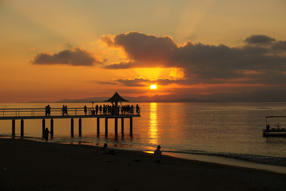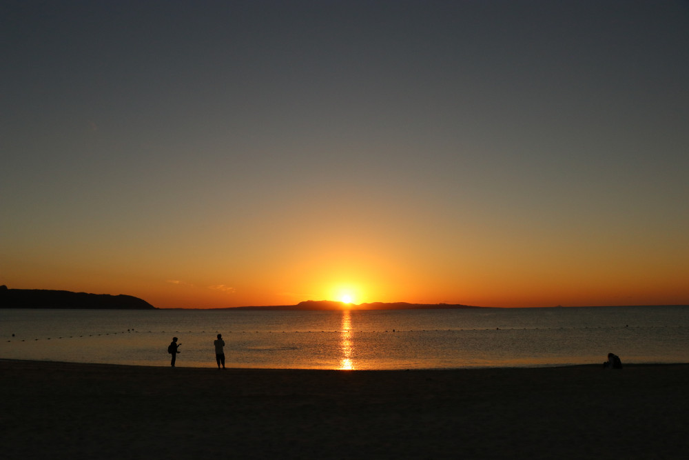 遠浅で一年中波が穏やかな底地ビーチ。昼・夕・夜で異なる風景が楽しめる人気スポットです。サンセット時の水平線に沈む真っ赤な夕日はまるで絵画のような美しさです。