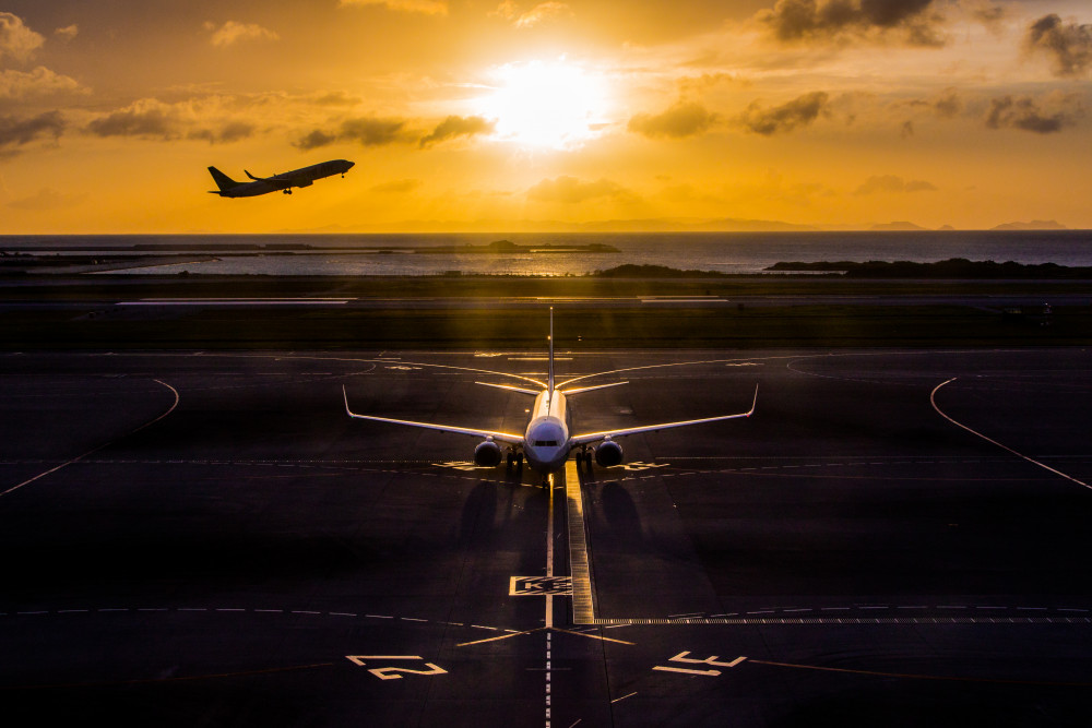 沖縄の空の玄関口である那覇空港。空港内や見学者デッキからは飛行機と滑走路の向こう側に沈む夕日を望むことができます。
