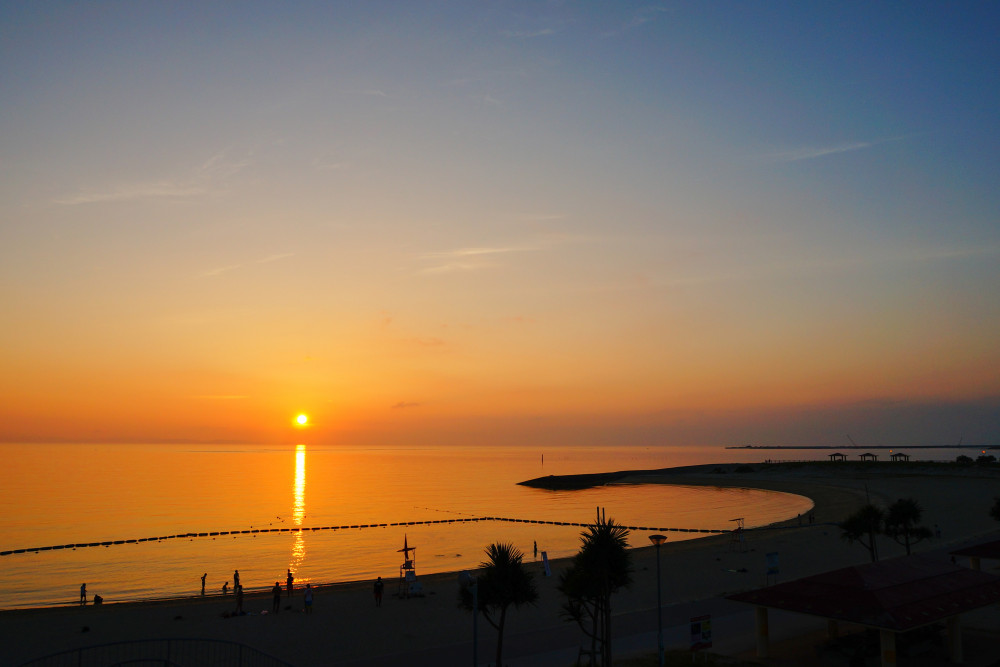 きめ細やかな白砂が7kmも続く砂浜は、東洋一と称えられています。透き通ったコバルトブルーの海に沈む夕日のコントラストは目を見張る美しさです。