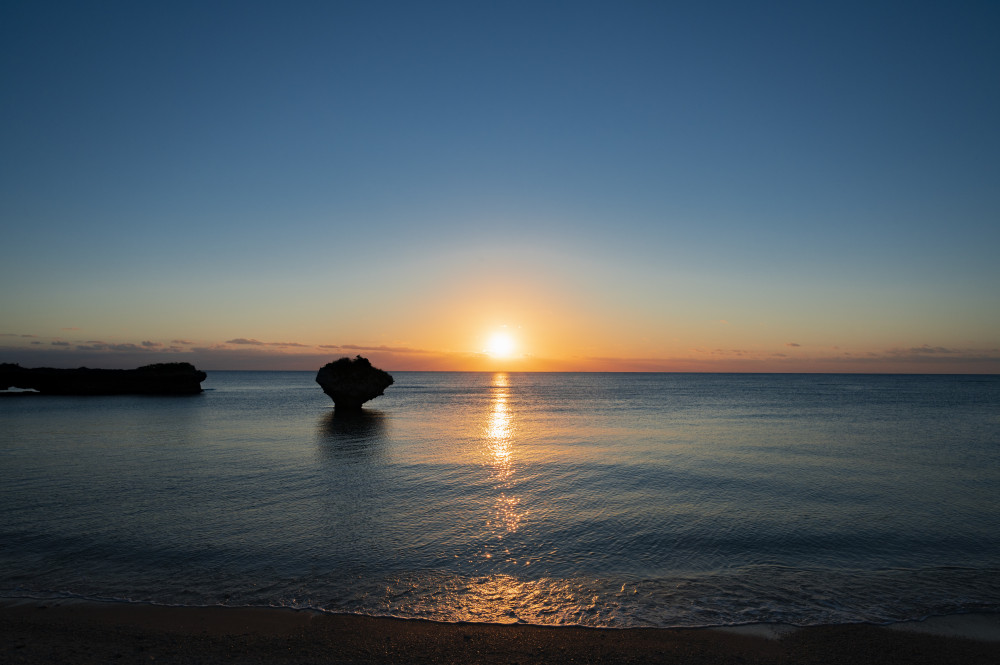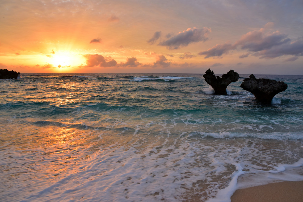 古宇利島の北側にあるハート岩(ハートロック)がシンボルのビーチ。夕焼けをバックにハートのシルエットが浮かび上がる景色は神秘的です。