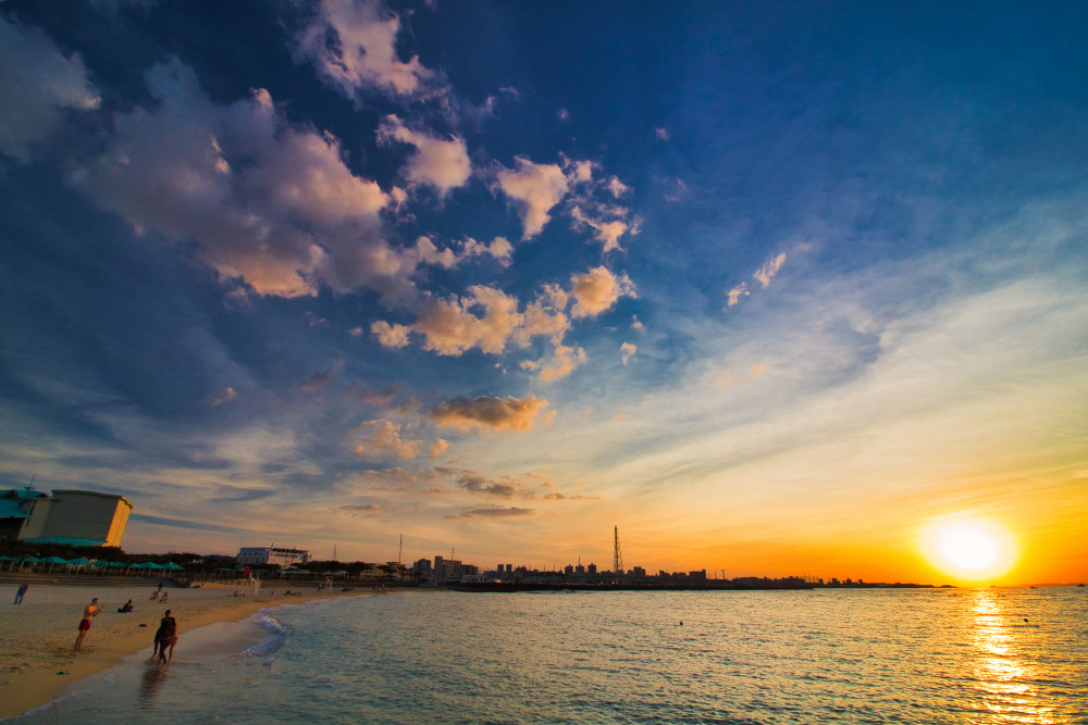 美浜アメリカンビレッジに隣接しているビーチ。沖縄県内有数のサンセットスポットでもあり、サンセットタイムにはたくさんの人でにぎわいます。