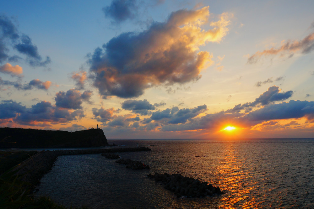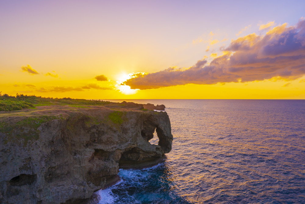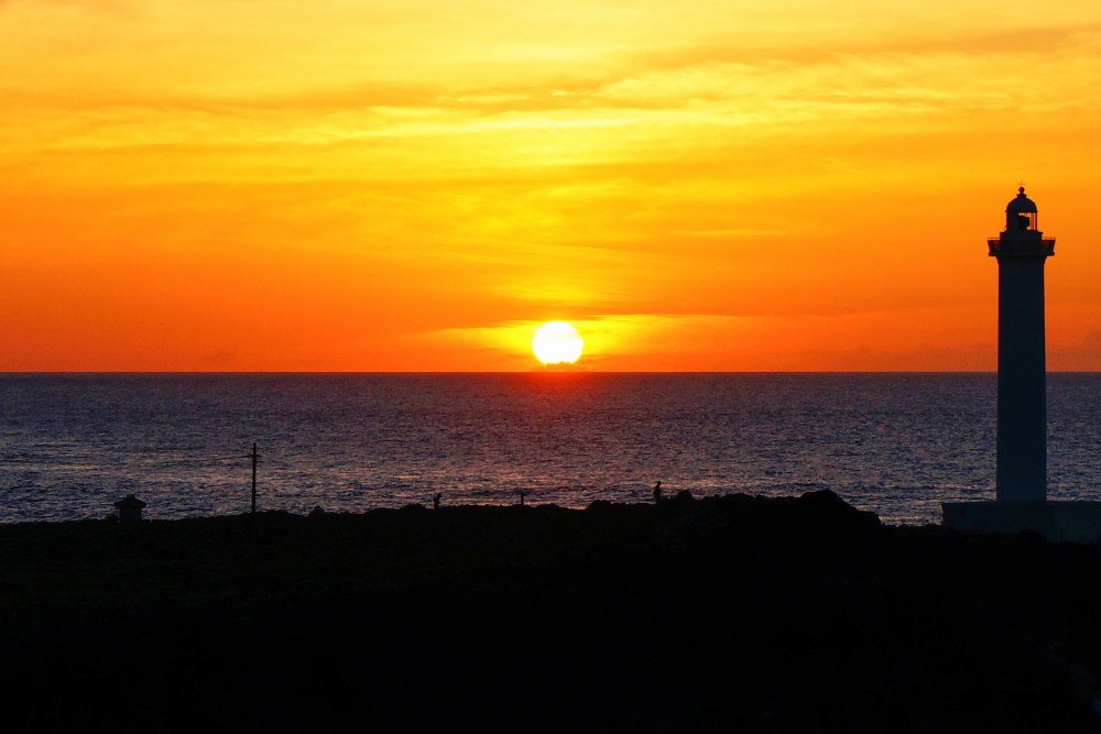 30mもの断崖絶壁が約2km続いており、岬の先端にはシンボルの白い灯台がある沖縄本島で夕日が最後に沈む場所として知られる絶景スポットです。
