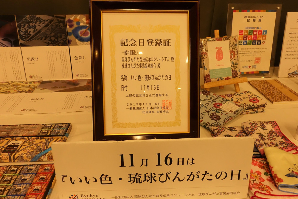11月16日は「いいいろ」の語呂合わせから「いい色・琉球びんがたの日」として、琉球王朝時代から続く「顔料」と「染料」を併用した「琉球びんがた」の活用の場を広げ、技を次世代へ引き継ぐことを目的に、2019年に日本記念日協会によって認定されました。