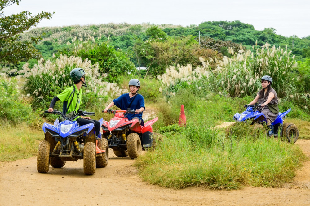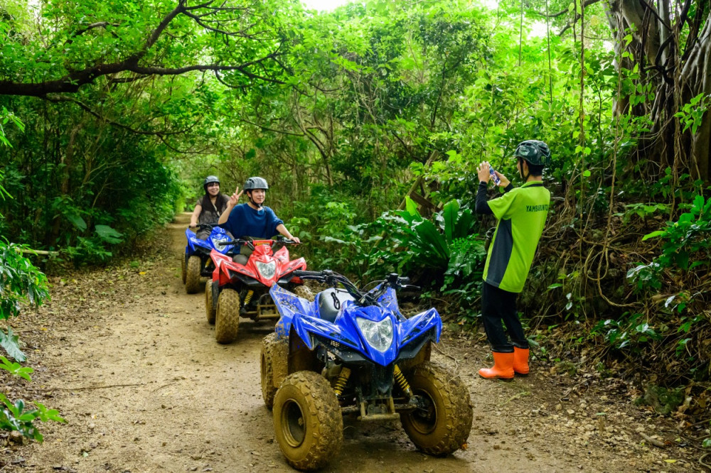“楽しみながら沖縄を知る・学ぶ”がテーマの「ガジュマルンチャー 糸満店」では、沖縄本島・南部の自然の魅力を感じるエキサイティングな4輪バギー体験が楽しめます。亜熱帯の植物が生い茂るジャングルでのバギーライドは、まさに非日常の世界。童心に返って思い切り楽しむことができます。まずは専任ガイドと一緒に模擬ルートで乗車練習をし、それぞれの習熟度に合わせてコースのルートを決めるため、約60分のバギーライドは初心者でも安心して体験できるのが大きな魅力です。