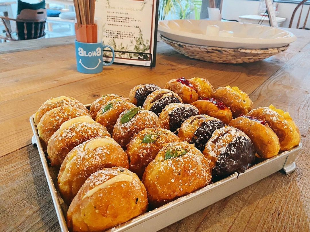 外がサクサク、中がフワフワの生サーターアンダギーのほか、自家製バンズのハンバーガーも絶品!目の前が名護市民ビーチなのでテイクアウトしてピクニック気分で楽しむこともできます!