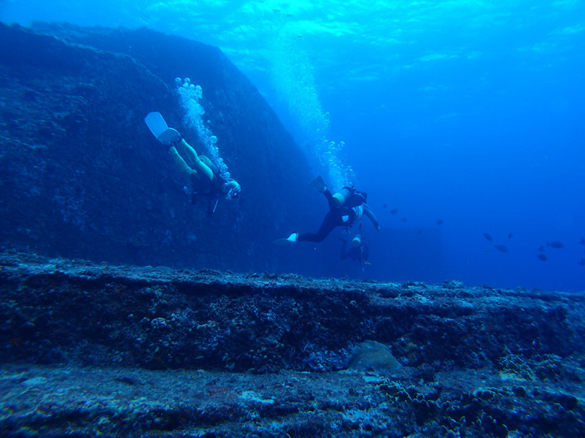 与那国島の海底に眠る全長約100m・幅約60m・高さ約25mの巨石群。階段や石柱など人工構造物のようにも見えるミステリアスな地形がどのようにできたのかは、現在も調査中です。自然の造形か、はたまた人口構造物か。与那国島では、ダイビングや半潜水海底観光船で、この神秘的な海中風景を楽しむことができます。
