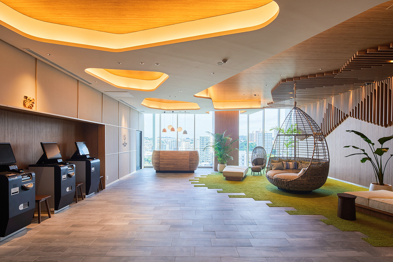 自然豊かなやんばるの大きなガジュマルの上でくつろぐようなステイが叶うシティリゾートホテル。木の根の間をくぐり抜けるようなエントランスをはじめ、やんばるの生き物をモチーフにした木製オブジェが潜んでいるなど、館内の随所で木の温もりが感じられます。