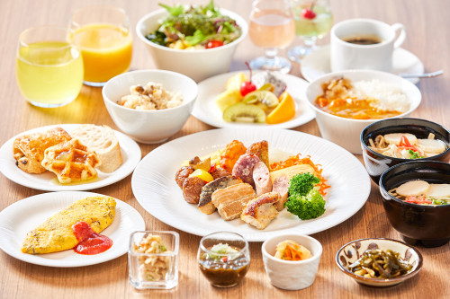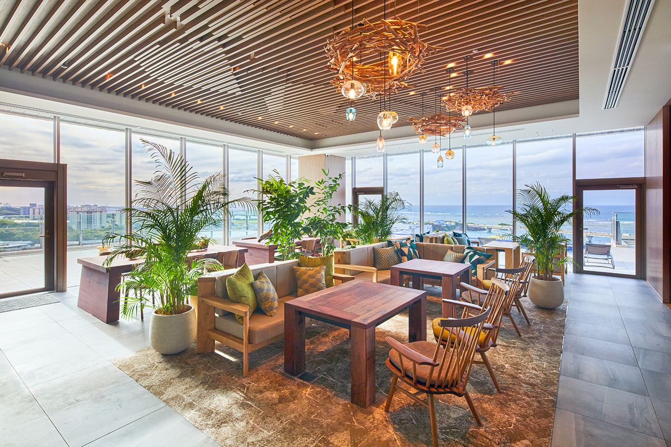 高層階ならではの眺望が楽しめるCafe & Dining ACOUSA(アコウサ)では、沖縄の食文化を通して「やんばるとつながる」をコンセプトに沖縄県産食材など季節の野菜、食材を中心に提供されます。また、カフェラウンジ席は一部の座席にコンセントがありワーケーションにもおすすめです(館内Wi-Fi完備)。